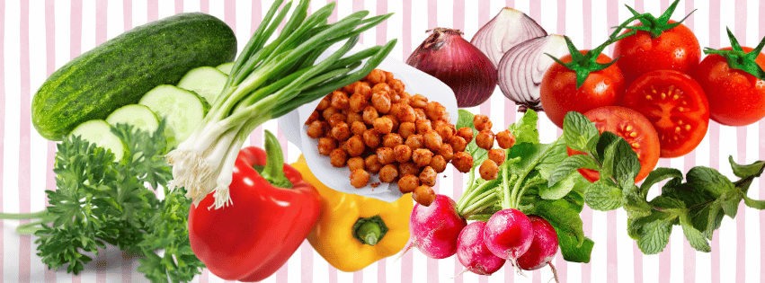 Gemüse, Kräuter und Dressing in eine große Schüssel geben. Gut durchmischen. - Kichererbsen hinzufügen: